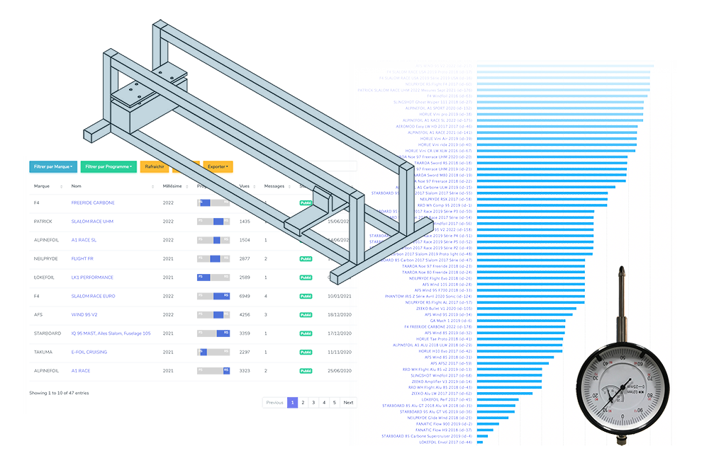Windfoilfan est une base de donnée collaborative regroupant les mesures, les caractéristiques, les compte rendu de test, les performances de plus de 200 produits dédiés au windfoil.