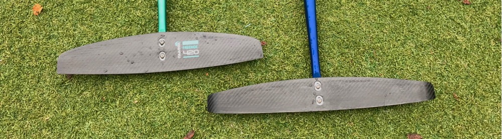En l'occurence, j'ai utilisé l'un de nos foils de référence, à savoir le F4 race (aile de 1000, fuslage de 120). Dans ces conditions ultra light, le F4 décolle plus facilement (je n'ai pas dit plus tôt, mais avec moins d'énergie dépensée), et surtout cape beaucoup plus dès qu'on est en l'air. La différence est flagrante : là où je faisais du travers avec le Noe, je fais 15° de cap supplémentaire. En contre partie, je vais un poil plus vite avec le Noe dans ces mêmes conditions (0.2 knt) , et le fuslage court et très rigide du Noe n'a aucune élasticité, contrairement aux foils de race dont le porte à faux énorme de l'aile avant introduit fatalement un certain flou dans la conduite.