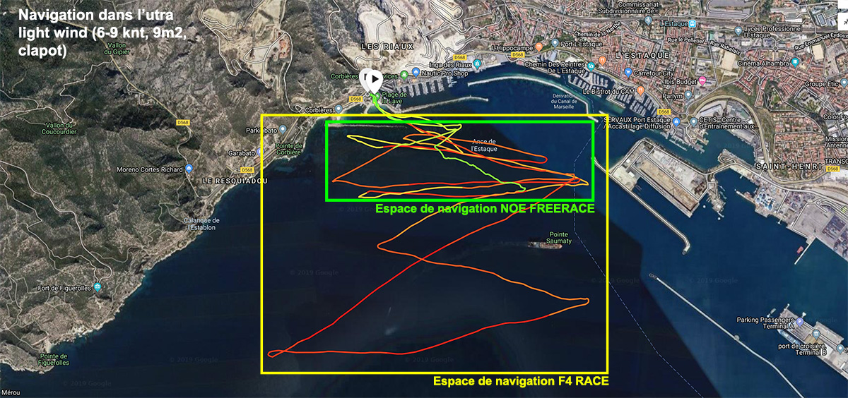 Dans ces conditions, la configuration aile de 800 / fuselage de 75+ avoue ses limites en dessous de 8-9 knt quand il faut toiler plus de 8m2. On garde en permanence une très bonne glisse, mais le foil devient pointu car l'aile de 800 à grand allongement tolère mal la sous-vitesse. Au contraire des aile à grosse surface, il faut toujours maintenir un vitesse un peu élevée pour garder le vol. Dasn les conditions légères, ceci impsoe au pilote d'être actif en permannce pour relancer ... ce qui est peut être un peu fatiguant à la longue. Bref, il faut 10knt pour que la nav' soit réellement agréable et confortable avec l'aile FreeRace.
